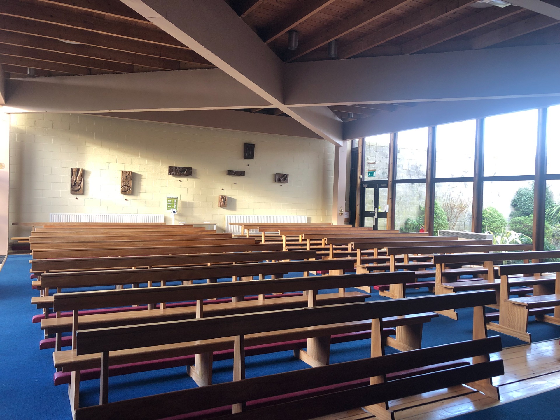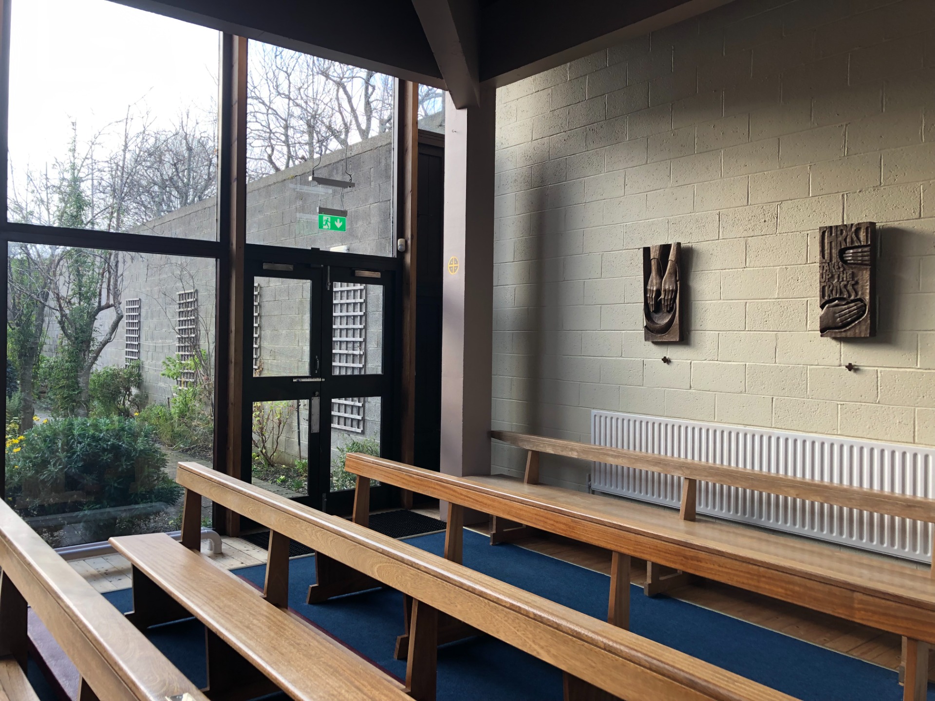 The photo above shows the interior of the church with seven of the fourteen stations on the wall behind the seats. The church is constructed with brick and ceiling-to-floor glass walls bringing the gardens inside the modern building. Imogen would have accessed the space before starting the commission and studied the light – where was it coming from, the proximity of the impending work to the congregation, the condition of the wall, the weight of the wood.