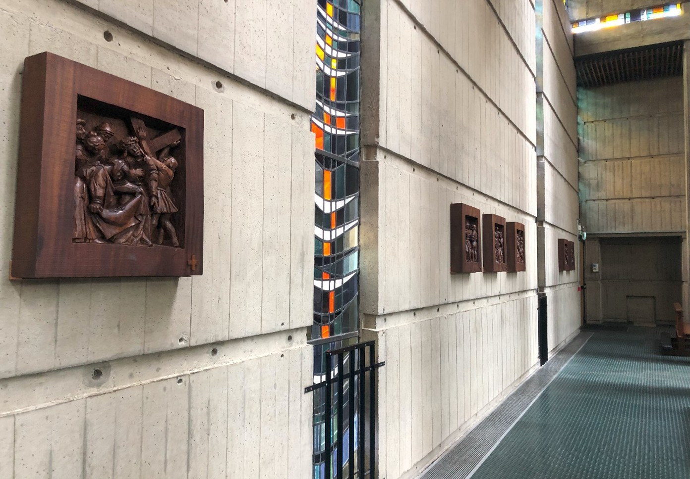 Taking over three years to finish the fourteen separate episodes, Jammet's stations are created from dark mahogany wood, and they hang against a polished concrete wall. Each measuring roughly 58.5cm x 61cm and just under 10cm deep, they are placed along the back wall of the church, facing the altar, the fourteen Stations are separated by two long vertical inserts of stained glass; in an abstract design, (see fig. 6).