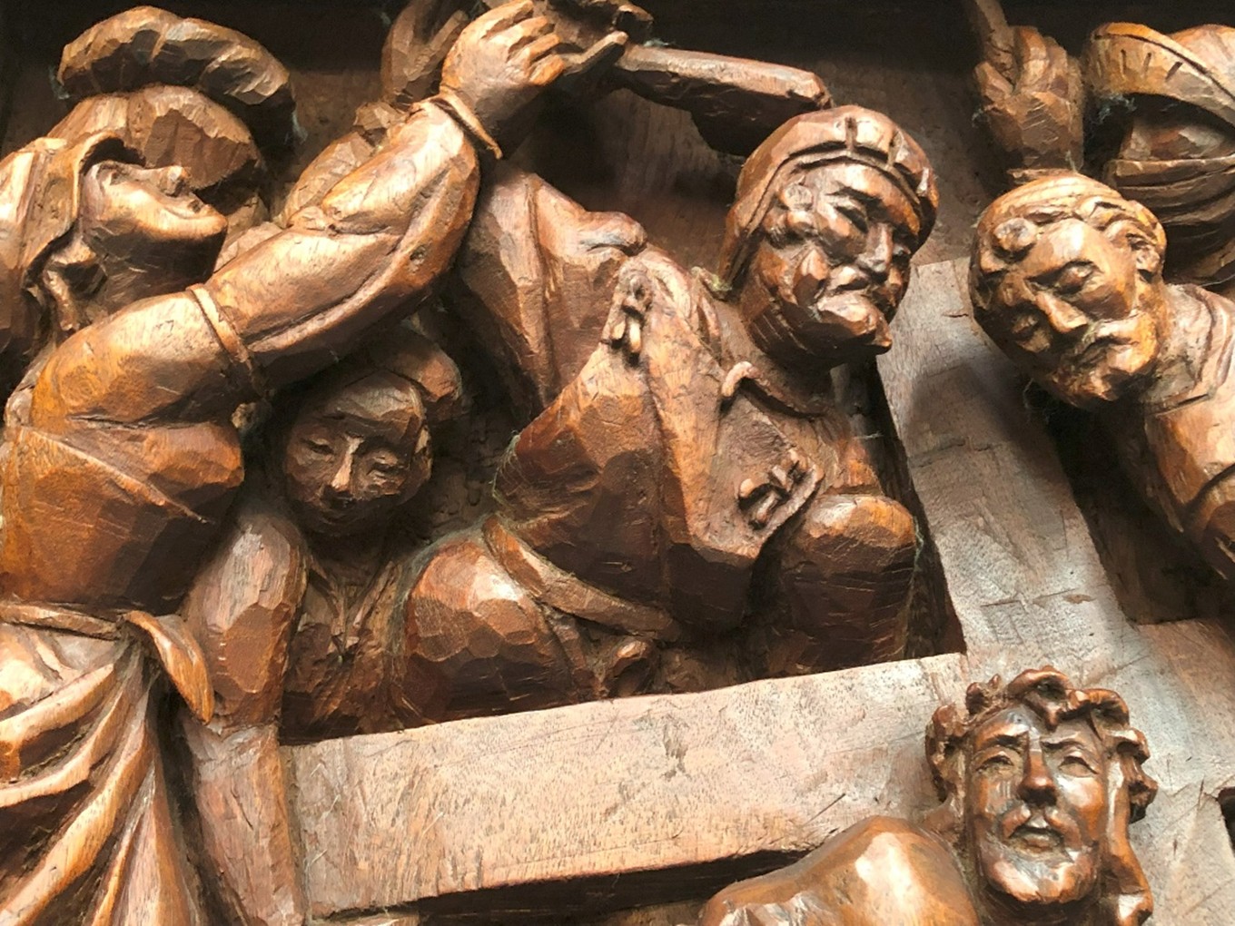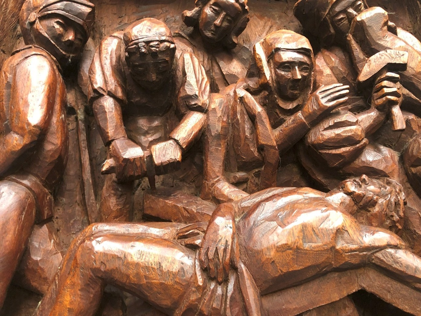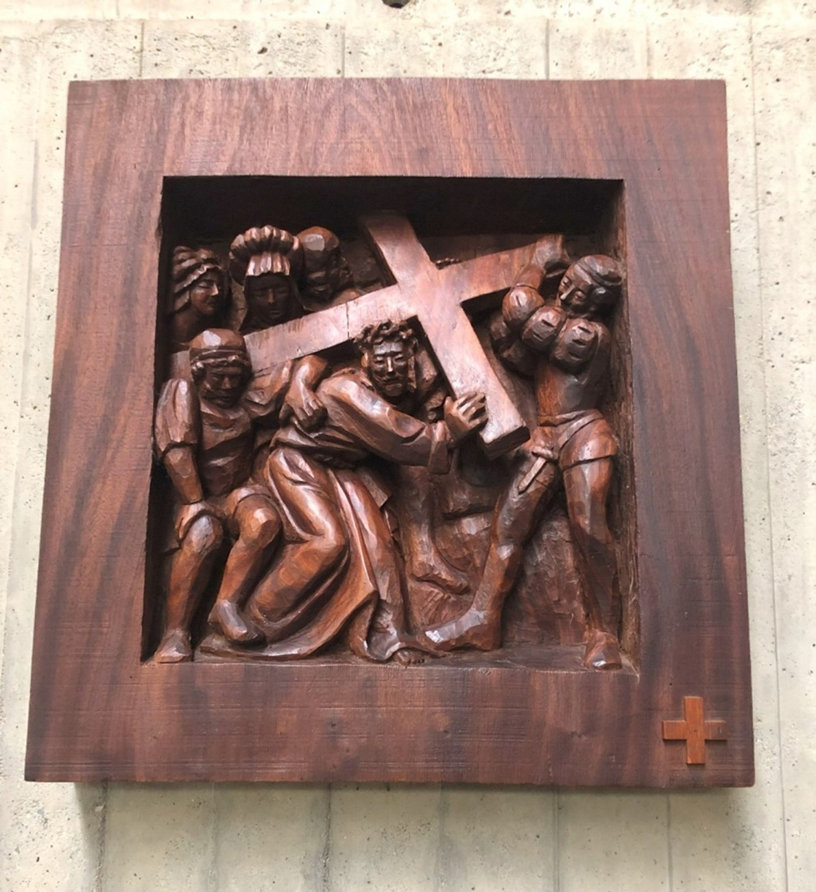 Just how heavy was the cross for one man? We get a sense of this in the second station (fig. 5) in the posture of the man on the left. The cross on his shoulder as he grips his right knee to balance himself, a very honest reaction, and shift the weight to Christ, leaning on him for support. We see the impossibility of this scene within the tight space, trying to settle the burden of the Cross on one man.