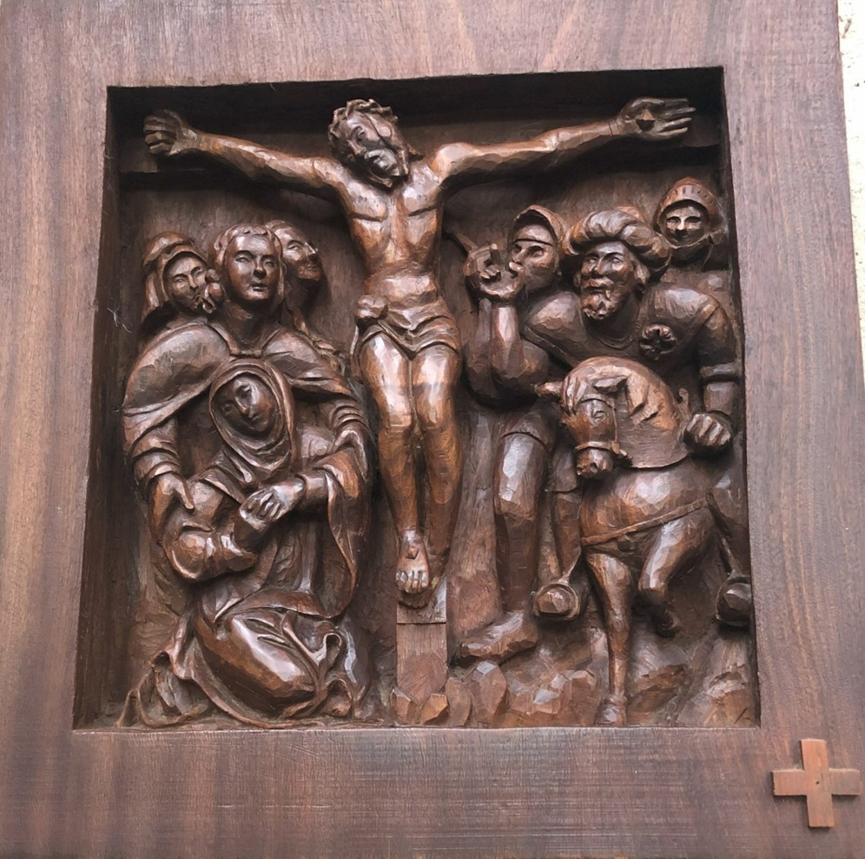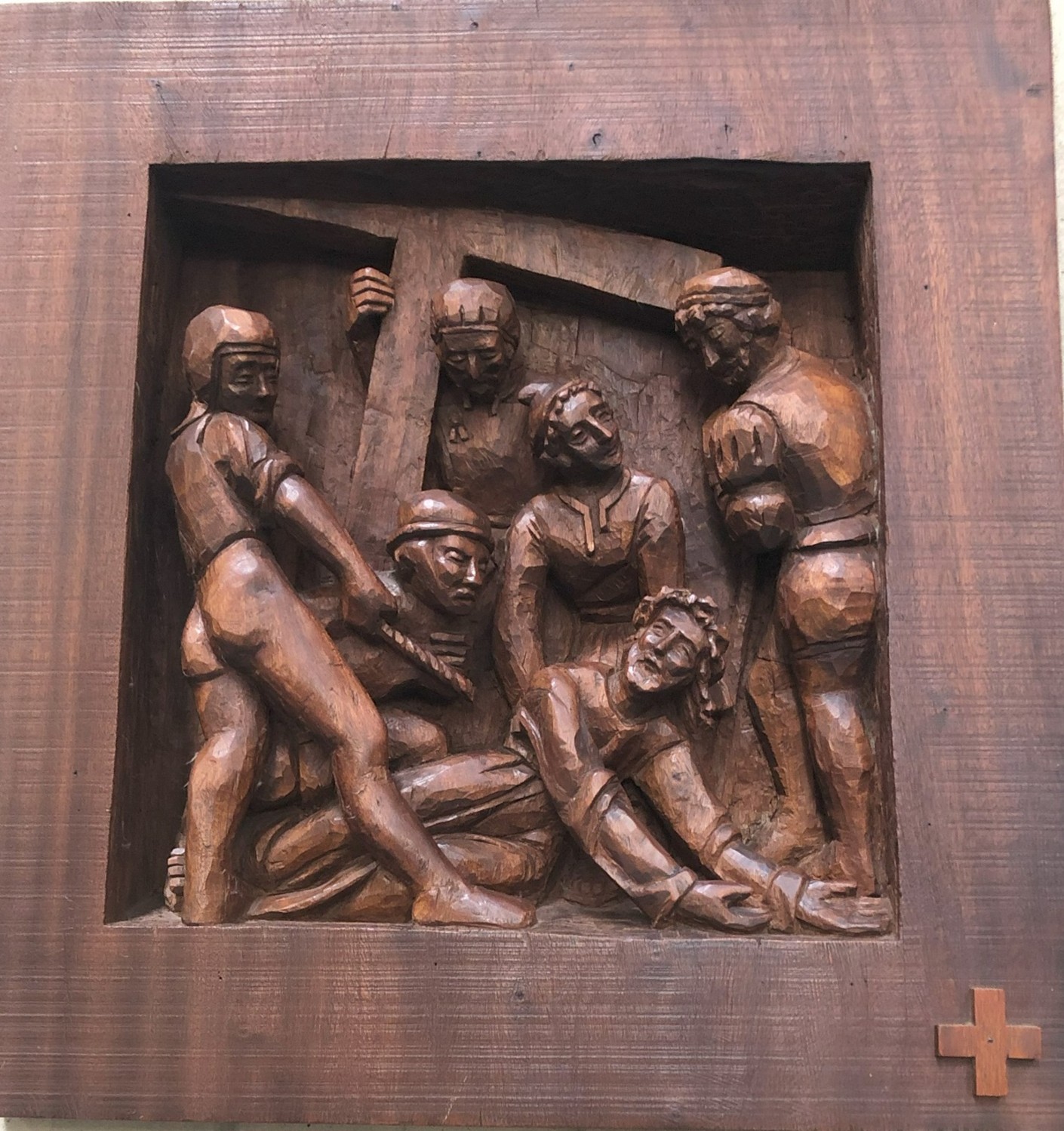 The twelfth station; the cross divides the narrative – a division of emotions and responses to Christ and his life of teaching. Christ welcomes all, in his reach across this part of the narrative with- physical hands stretching across the confined space – on the left his mother, friends, on the right, the populace. The soldier's' sword raised to pierce Christs' side to witness blood and water, and opposite; a portrait of a mother in grief.